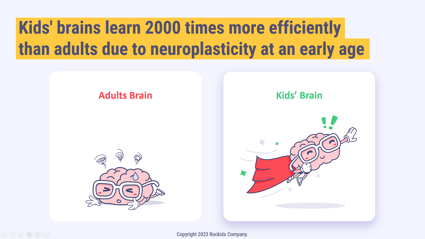 Think about it, a child's brain absorbs knowledge almost 2000 times more efficiently than an adult's. This is known as the neuroplasticity of early brain development, and it works from birth to about 6 years old, peaking at 3 years.